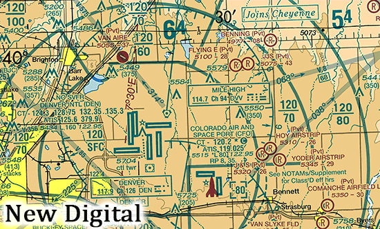 As it stands, the new-style digital charts are really difficult to read. It’s bad in Denver, but it’s a disaster in places like Philadelphia where everything just melds together into one indecipherable mess. The only practical solution is to turn on things like digital airspace overlays in the EFBs.