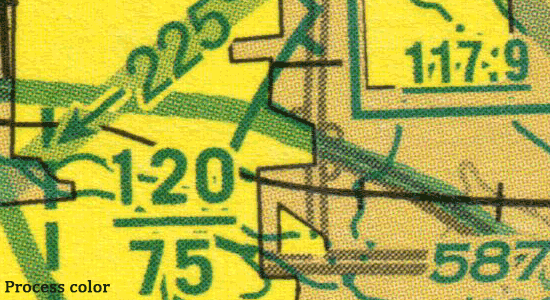 The October 2025 sectionals are printed with process color. Earlier sectionals, such as the October 2023 edition that I had on hand, were printed with spot color. The difference is shown in these zoomed-in portions of the scans of the new and old charts.