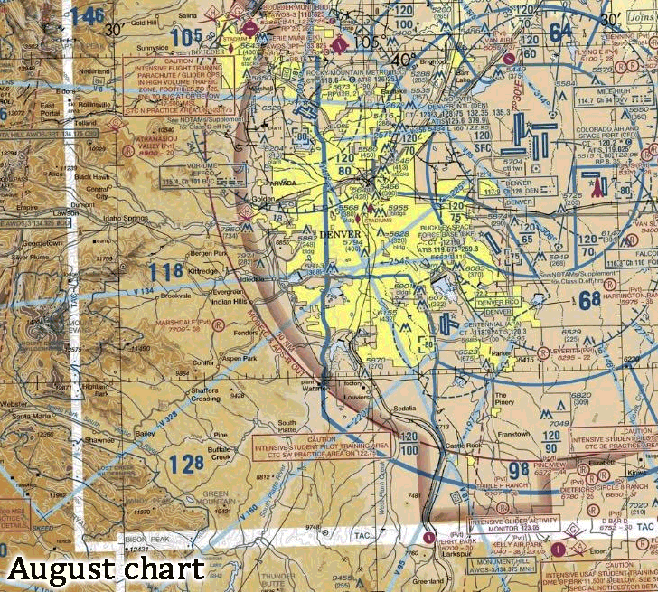 Reading the FAA’s announcement closer, it turned out that their goal was to make the digital versions of the charts match the print versions more closely. To a rounding error, nobody in aviation in the USA actually uses printed charts anymore, me included. It took a bit of effort for me to track down print versions of both the new October 2, 2025 edition of the Denver sectional as well as an earlier version from April 2023 so that I could compare them to the digital versions everyone really uses.